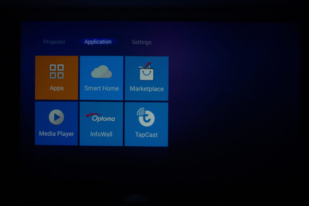 By móc wygodnie sterować tym projektorem producent wyposaża nas w bardzo mały, ale eleganci i wygodny pilot. Posiada on najważniejsze przyciski, z których będziemy najczęściej korzystać. Warto tutaj odnotować, że Optoma UHL55 jest smart projektorem, gdyż posiada on sklep z aplikacjami niczym z naszych smartfonów (usługi Google Play nie są obsługiwane), dlatego możemy na nim zainstalować Netflixa, Youtube’a, HBO GO, Spotify i nie tylko.