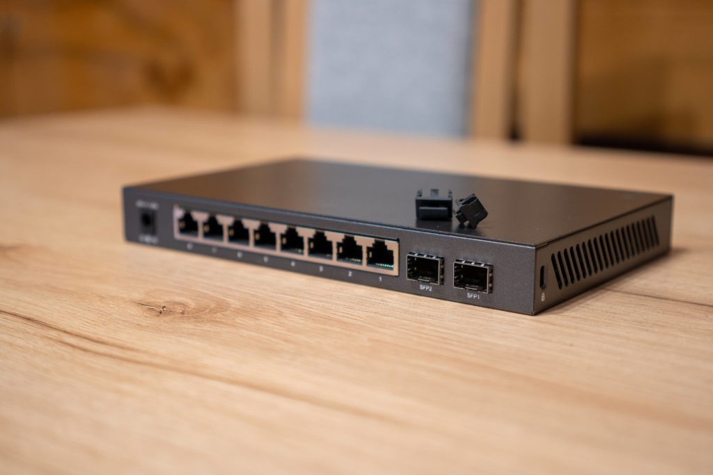 Kolejnym urządzeniem, które sobie omówimy, jest przełącznik, czyli switch. W tym przypadku jest to ośmioportowy przełącznik z PoE oraz dwa slotami SPF. Sprzęt ten obsługuje gigabitowe złącza, gdyż skierowany jest on do osób, które potrzebują mocniejszego sprzętu. Oprócz tego trzeba wspomnieć, że switch ten jest w pełni konfigurowalny, więc bez problemu ustawimy go pod siebie. Niestety, ale osoby bez jakiejkolwiek większej wiedzy odnośnie konfigurowania sieci z pewnością pogubią się w mnogości ustawień. Mimo to switch jest przygotowany do tego, by po prostu podłączyć do niego urządzenia i z niego korzystać. Na start, powita nas również bardzo prosta strona konfiguracyjna, przez którą należałoby przebrnąć.