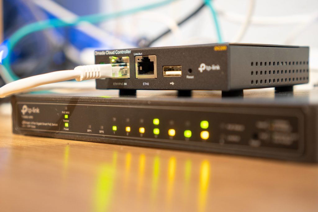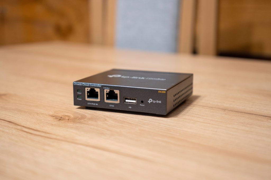 Access Pointem możemy sterować z poziomu strony internetowej, lecz istnieje również możliwość rozszerzenia tego o właśnie odpowiedni do tego kontroler. Omada Cloud OC200, to małe urządzenie zasilane poprzez PoE, czyli po raz kolejny wykorzystujemy potencjał naszego switcha i jego obsługi zasilania przez kabel Ethernet.