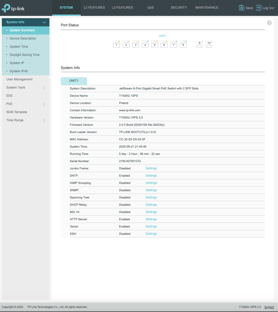 Obsługa PoE jest dla mnie bardzo ważna, ponieważ tym sposobem zasilam kolejny składnik mojej infrastruktury. Maksymalnie możemy dostarczyć do naszych urządzeń 53 W. Limit i obecne wykorzystanie będzie można sprawdzić na stronie konfiguracyjnej.