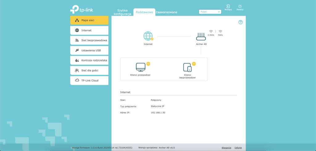 Poniżej przedstawiam Wam wygląd strony do zarządzania routerem. Oprócz tego producent dostarcza również aplikacje na smartfona, z której poziomu mamy dostęp do najważniejszych ustawień. Warto zaznaczyć, że router dystrybuuje Wi-Fi w dwóch częstotliwościach naraz, czyli 2.4 i 5 GHz, lecz standardowo na dwóch różnych SSID.