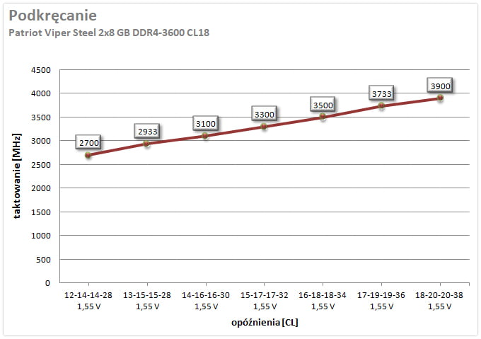 To, ile jesteśmy w stanie uzyskać na danej platformie, zależy od wielu czynników. Na przykład bardzo podobny zestaw DDR4-3600 CL 17 (również Patriot Viper Steel) jest w stanie przy DDR4-3600 uzyskać opóźnienia rzędu CL 16-18-18-34 przy napięciu 1,35 V, a to już niewiele mniej od tego, co znajdziemy w najbardziej wypasionych zestawach na rynku, bazujących na kościach pamięci Samsung B-Die (marzenie każdego overclockera!) kosztujących ok. 600 zł. W większości przypadków, jak np. platforma z procesorem Intel Core 12. generacji, takie drogie moduły uzyskają wprawdzie najwyższą wydajność, ale różnica sięga często zaledwie ok. 5%, co tylko pokazuje, jak opłacalnym zestawem jest bohater dzisiejszego artykułu. 50% mniej pieniędzy za 5% mniej wydajności? Biorę!