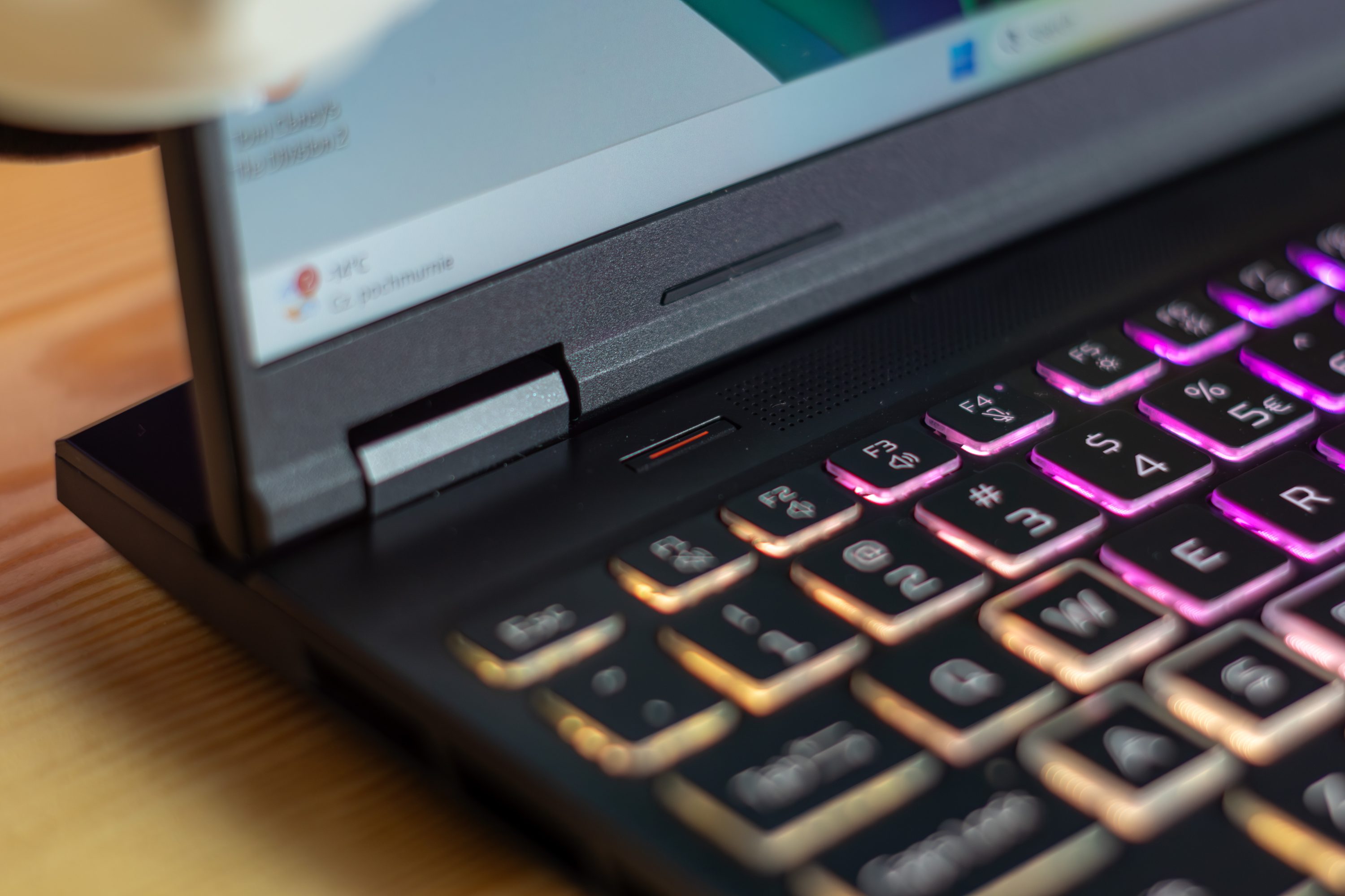 Najbardziej „użytkowym” elementem specyfikacji jest ekran: 16 cali, 2560×1600 (WQXGA), 180 Hz, matowy, 16:10. Matowa powłoka pomaga w jasnym otoczeniu, 16:10 daje więcej przestrzeni w pionie, a 180 Hz jest odczuwalne nie tylko w grach, ale też w samym Windowsie. Na plus działa też Advanced Optimus — przełączanie grafiki odbywa się automatycznie zależnie od obciążenia, więc nie trzeba ręcznie pilnować trybów przy przejściu z pracy do grania.