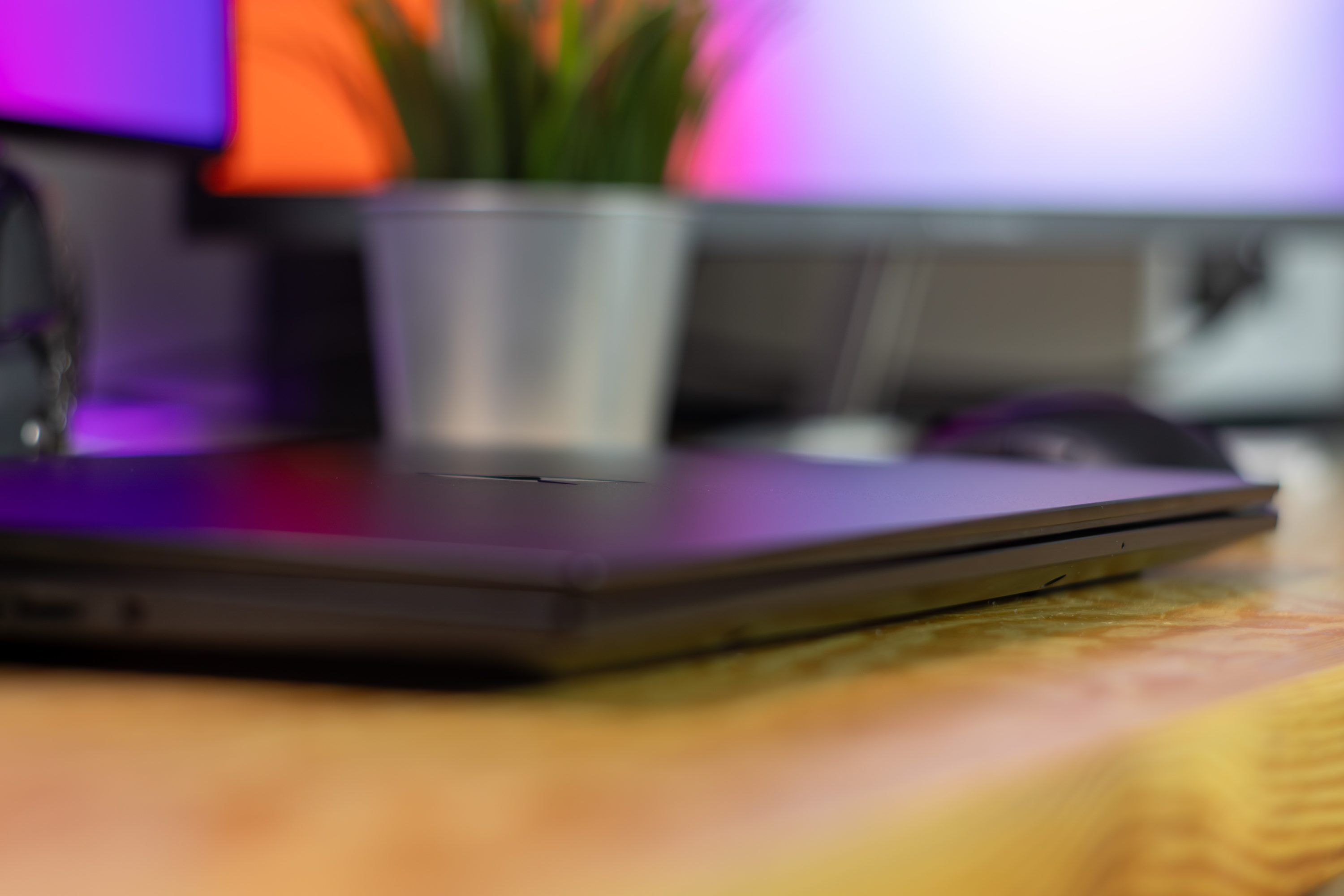 Pierwsze wrażenie jest proste: to nie jest typowy „gamingowy kloc”. Obudowa ma mniej niż 19.9 mm i w tej klasie robi to różnicę od razu — w dłoni, na biurku i w torbie. Nie ma tego wrażenia, że laptop zaczyna dyktować ci styl życia samą swoją gabarytową obecnością. Do tego dochodzi masa (2,18 kg), która — bez udawania ultrabooka — nie jest bardzo odczuwalna jak na 16 cali. To jest właśnie ta cicha przewaga: laptop nie staje się pretekstem do tego, żeby jednak zostawić go w domu.
