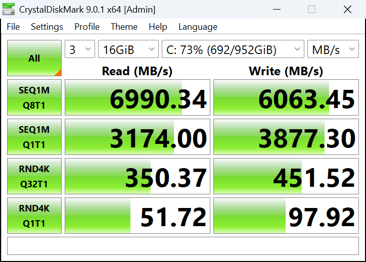 SSD NVMe wypada jak trzeba i nie robi z siebie wąskiego gardła. W CrystalDiskMark (32 GiB) SEQ1M Q8T1 osiągnął 6987 MB/s odczytu i 6083 MB/s zapisu, a SEQ1M Q1T1 odpowiednio 3228 MB/s i 3841 MB/s. Dla małych bloków RND4K Q1T1 wyniósł 52 MB/s odczytu i 97 MB/s zapisu. Wyniki były spójne między przebiegami, co w praktyce oznacza szybkie ładowanie gier i sprawne przerzucanie plików bez poczucia, że magazyn danych hamuje całą resztę.