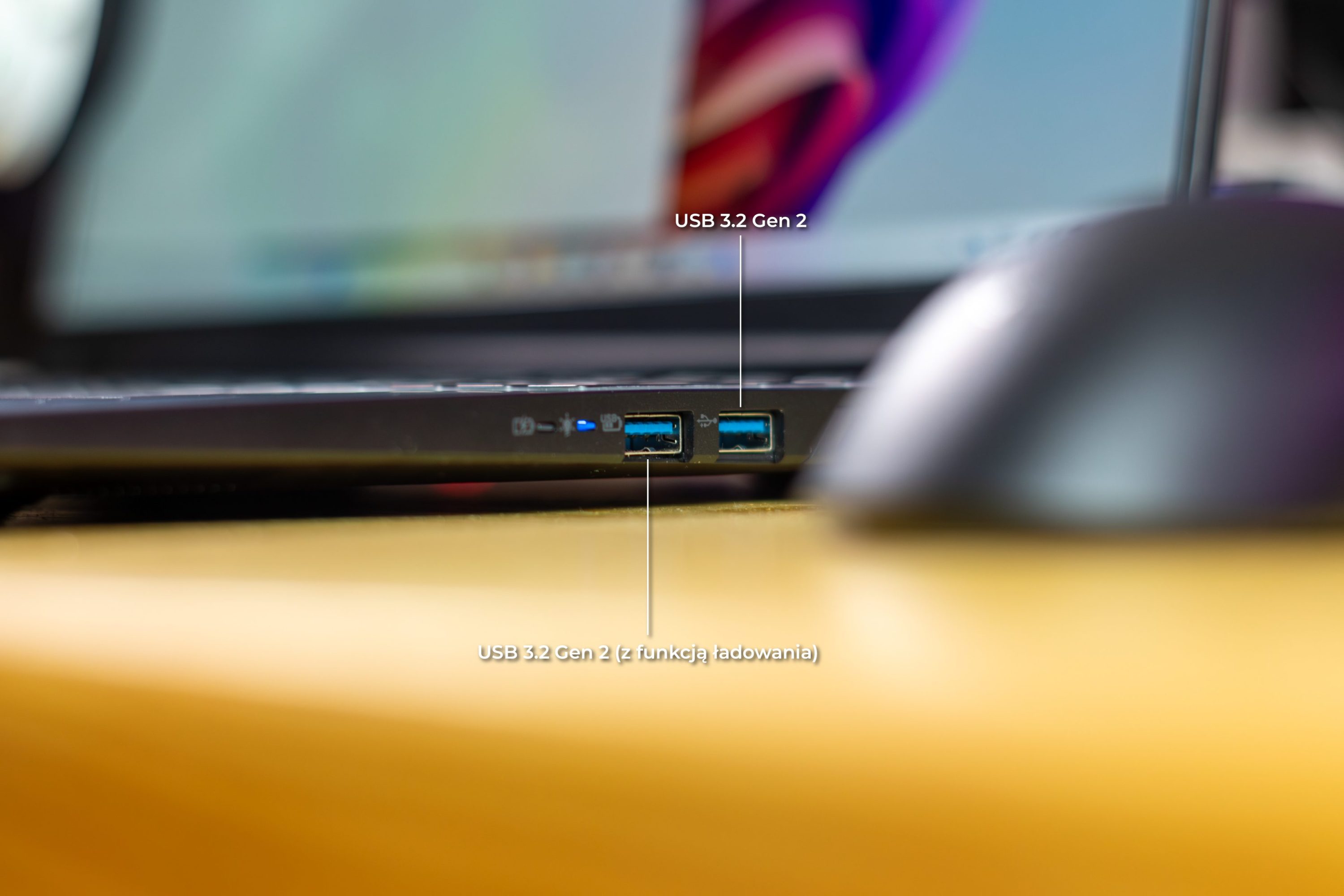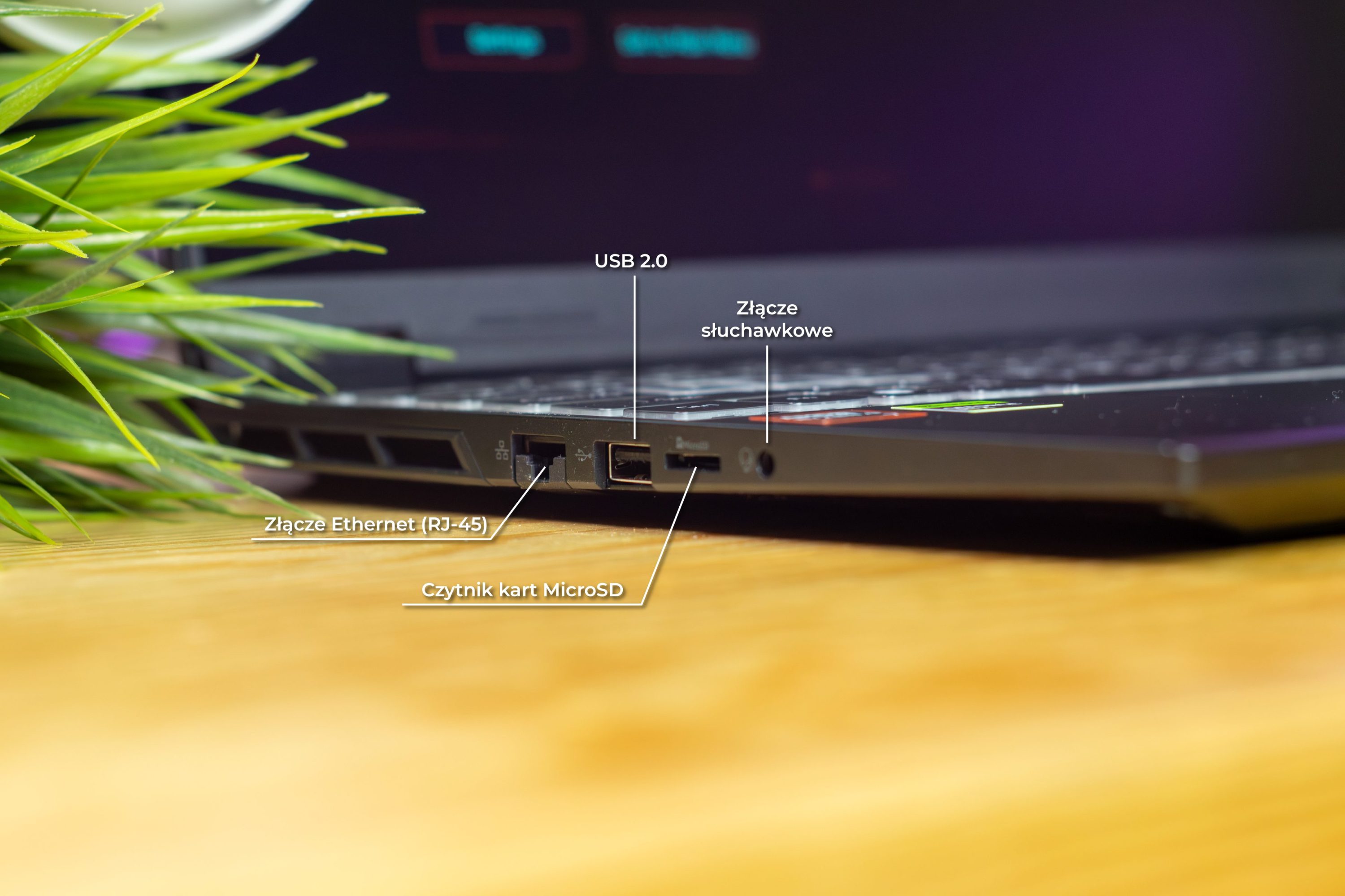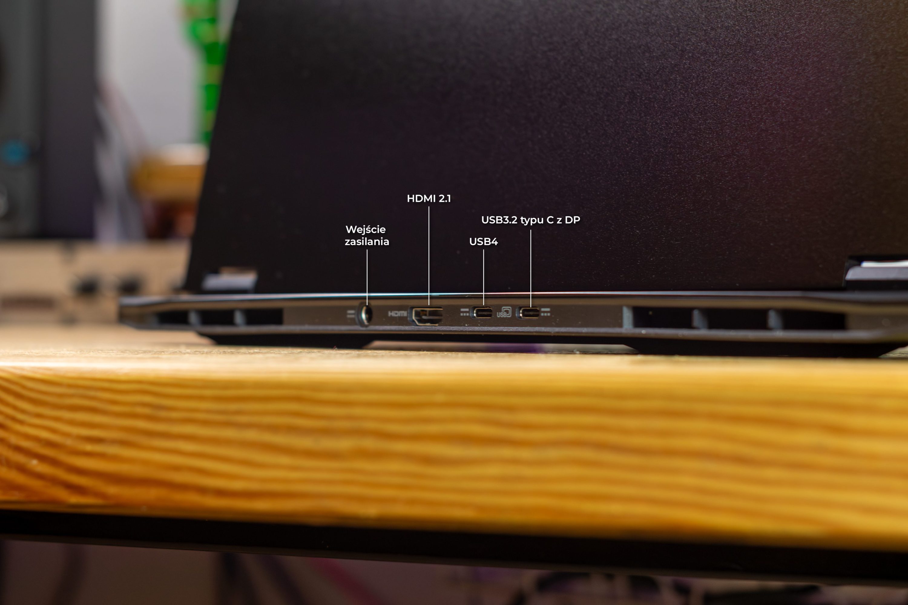 Rozmieszczenie portów (z tyłu i na bokach) jest po prostu użyteczne — i to się docenia wtedy, kiedy laptop stoi na biurku podłączony do „życia”: monitor, zasilanie, sieć, peryferia. Na pokładzie są dwa USB-C: jedno z USB4, drugie z USB 3.2 Gen 2 i DisplayPort przez dGPU — oba z możliwością ładowania do 90 W (20 V), co po prostu upraszcza życie, gdy chcesz zasilać laptop z jednej ładowarki. Do tego dochodzą trzy USB-A: dwa USB 3.2 Gen 2 i jedno USB 2.0; jeden z portów wspiera ładowanie po wyłączeniu, HDMI 2.1 z HDCP, RJ-45, czytnik microSD i klasyczne 3,5 mm pod słuchawki lub headset z mikrofonem. Osobno jest też klasyczne gniazdo zasilania do zasilacza, więc nie musisz traktować USB-C jak jedynej drogi.