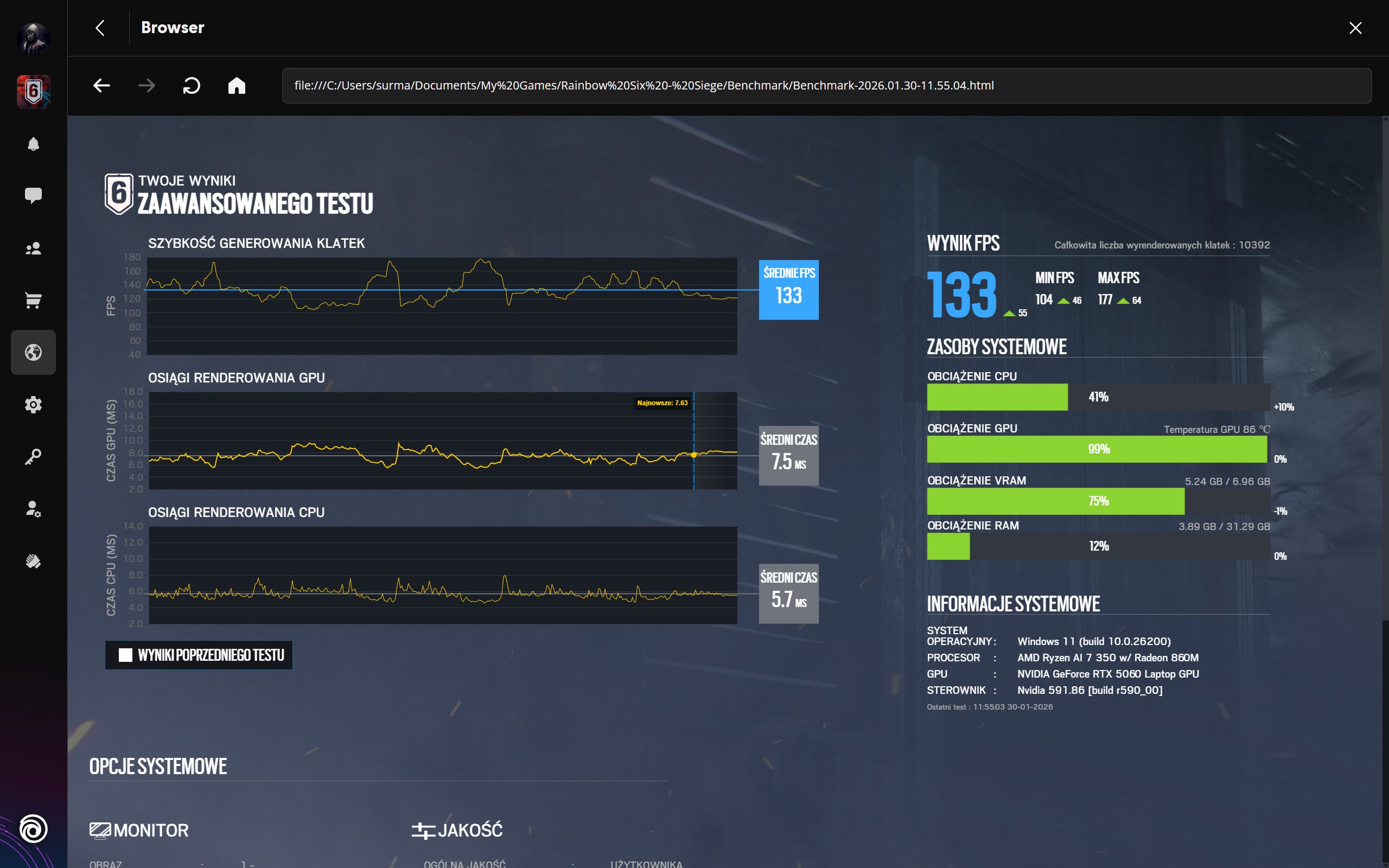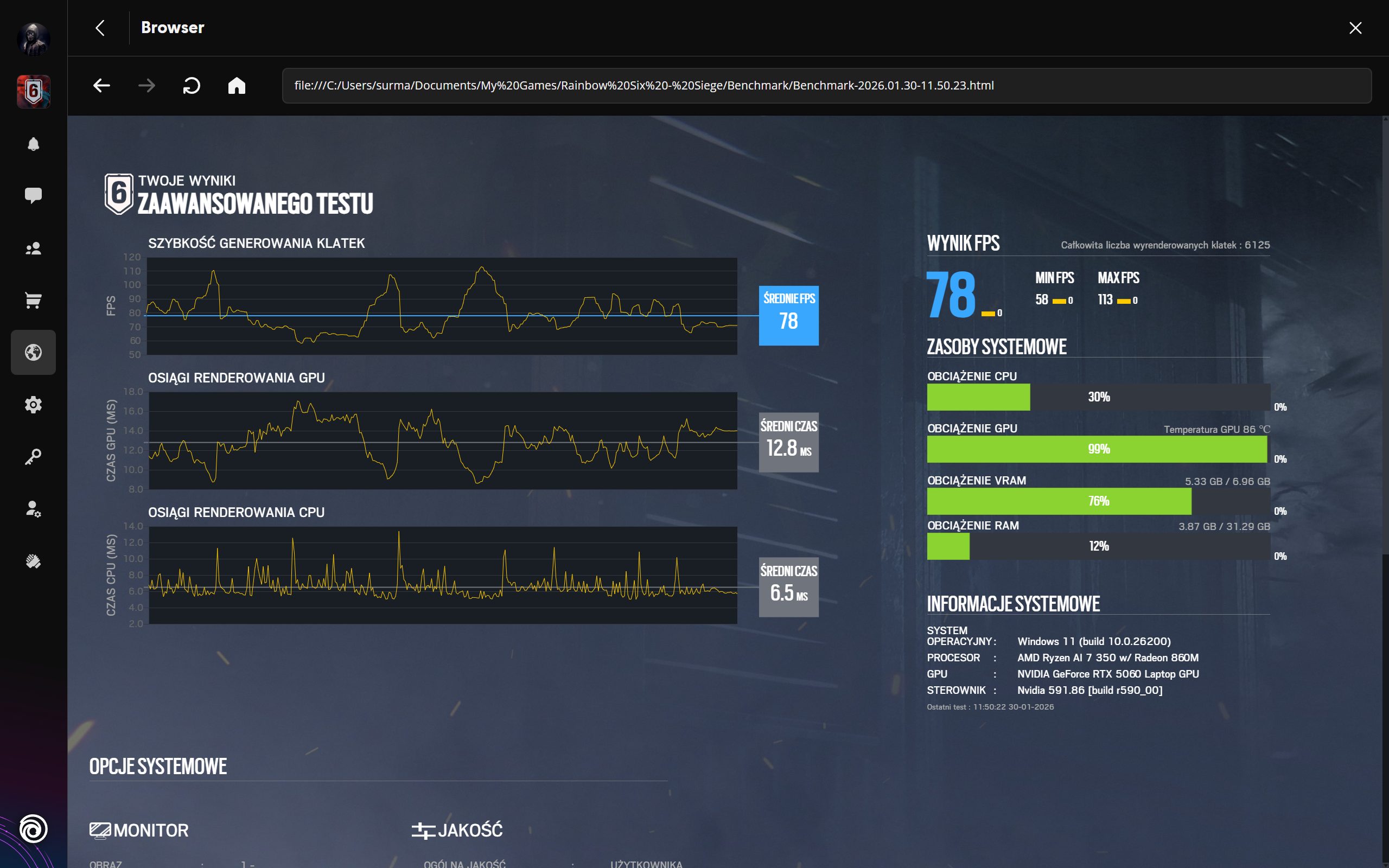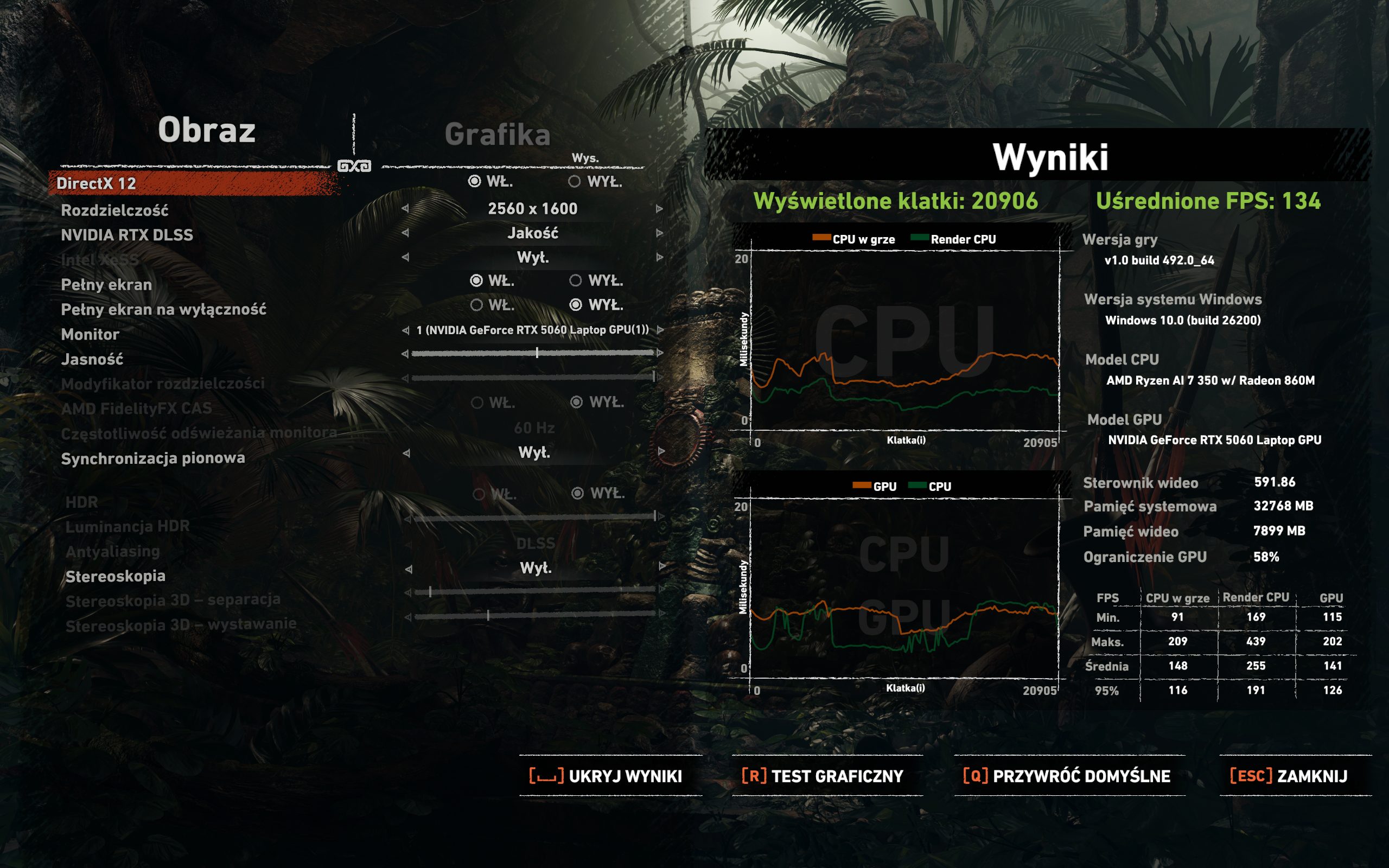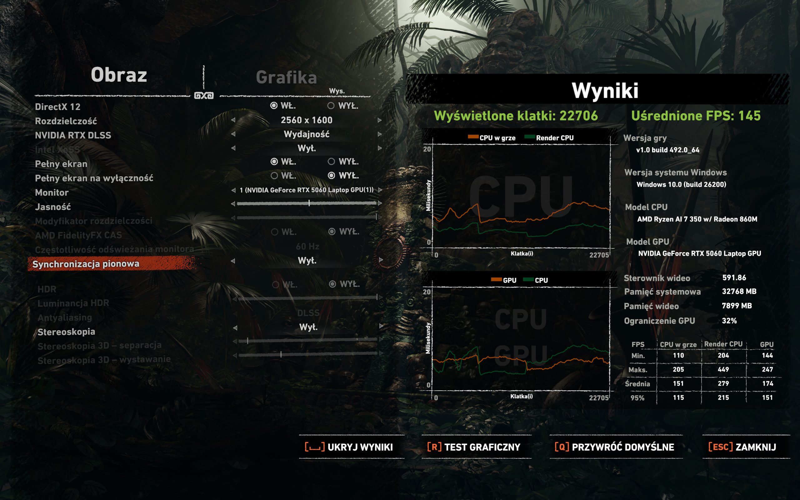Sercem testowanego modelu jest procesor AMD Ryzen AI 7 350, wspierany przez grafikę NVIDIA GeForce RTX 5060 Laptop oraz 32 GB pamięci RAM. Aby okiełznać tę moc, producent zastosował ciekły metal na CPU oraz wydajny system chłodzenia z dwoma wentylatorami, czteroma wlotami i wylotami powietrza. Testy przeprowadzone w rozdzielczości 2560×1600 (tryb Turbo) udowadniają sens tej konstrukcji. Matryca 1600p nie jest tu tylko efektownym dodatkiem, lecz środowiskiem, w którym Nitro 16S AI realnie pozwala grać. Co ważne, technologie DLSS i FSR nie są tu kołem ratunkowym, ale naturalnym narzędziem gwarantującym płynność przy tak wysokiej szczegółowości obrazu.
