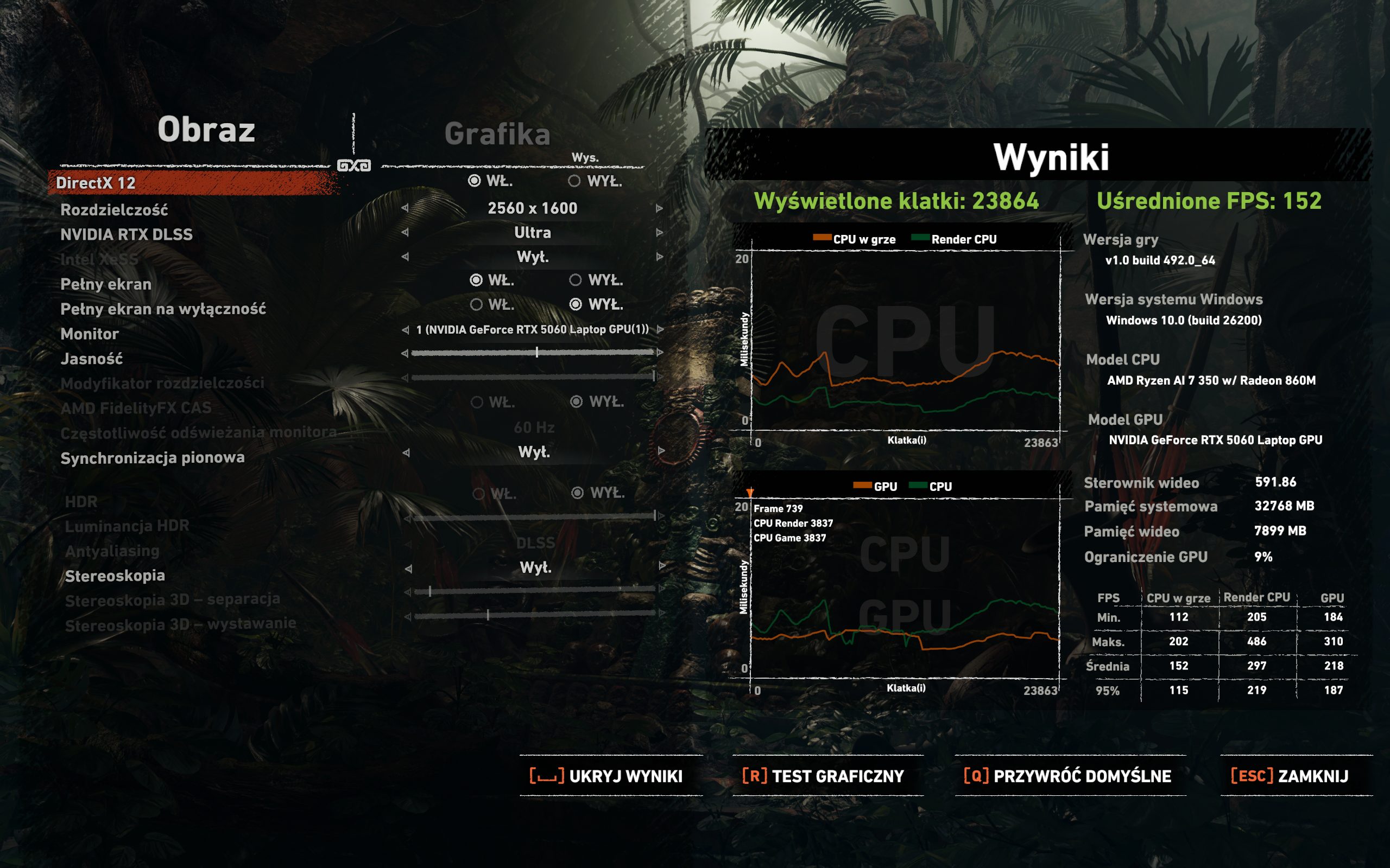 W tytułach przygodowych RTX 5060 również radzi sobie dzielnie, choć widać tu wpływ wysokiej rozdzielczości 1600p. W Shadow of the Tomb Raider (DX12) bazowy wynik bez DLSS to solidne 102 kl./s. Włączenie DLSS Quality podbija go do 134 kl./s. Co ciekawe, dalsze schodzenie z jakością obrazu (tryby Performance i Ultra Performance) daje już mniejsze przyrosty (odpowiednio 145 i 152 kl./s), co sugeruje, że w tym scenariuszu wąskim gardłem powoli staje się nie GPU, a inne podzespoły.