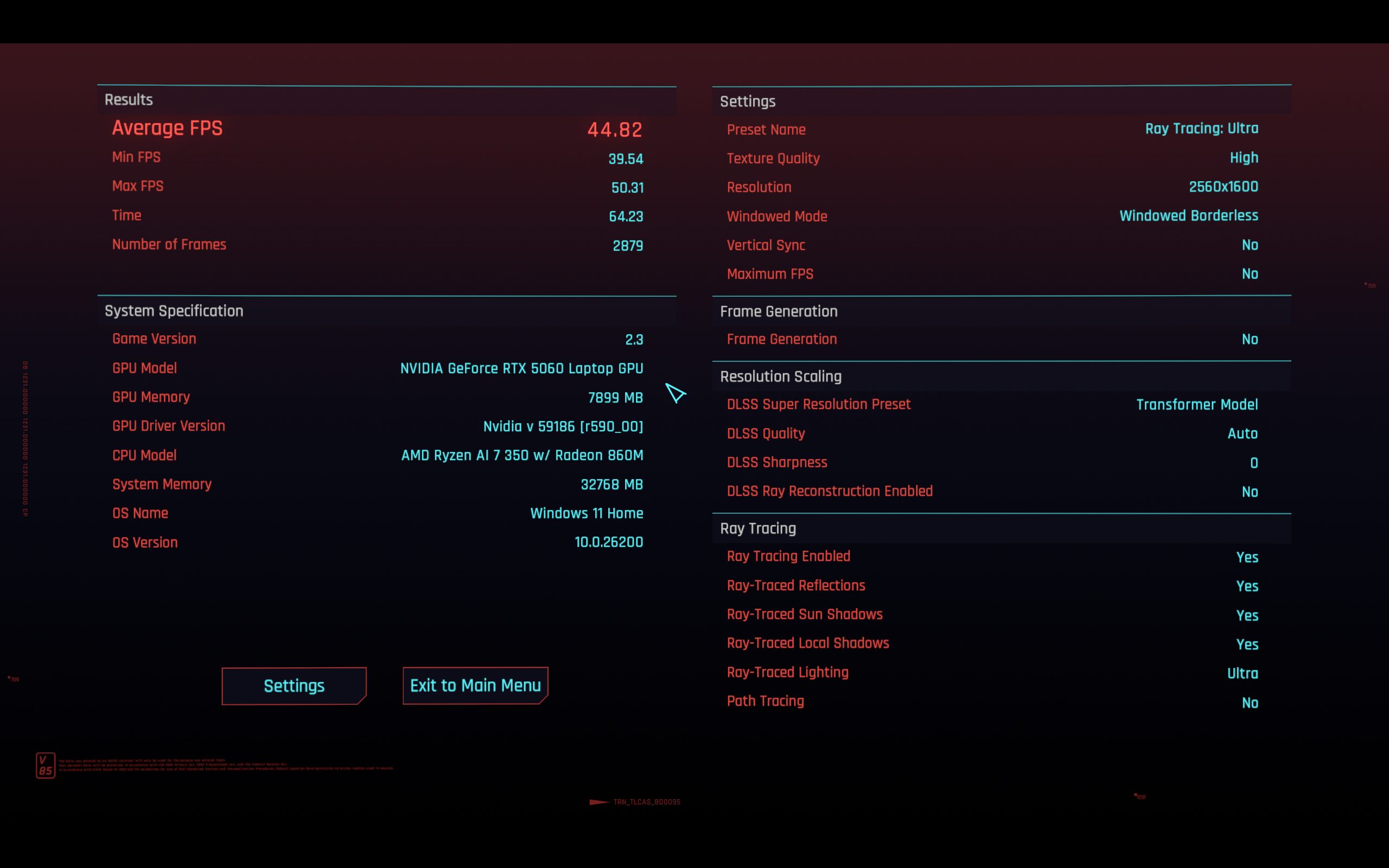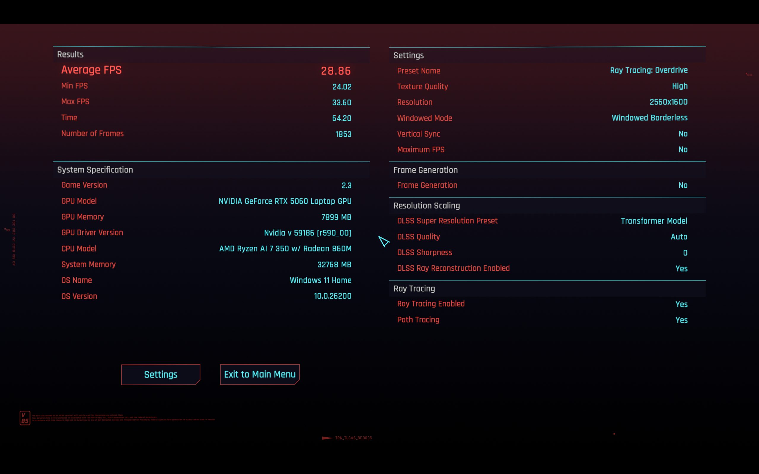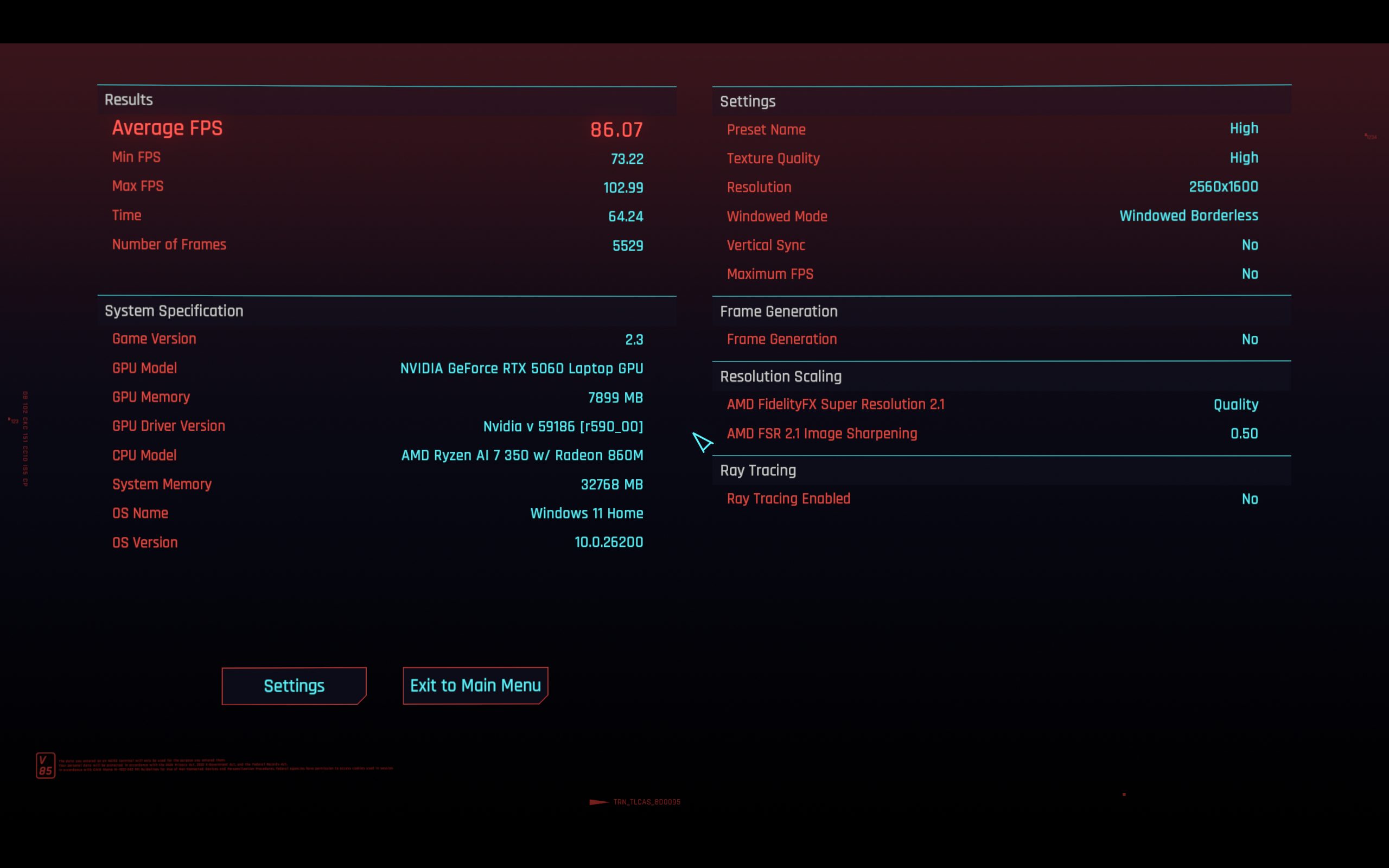 Night City to zawsze najtrudniejszy test. Jak radzi sobie Nitro 16S AI w 1600p? Bez Ray Tracingu, na ustawieniach High z FSR 2.1 Quality, uzyskujemy bardzo komfortowe 86 FPS. Podbicie detali do Ultra obniża ten wynik do około 66 FPS. Przełączenie się na DLSS Quality daje podobny rezultat (66 FPS), a tryb Performance pozwala wrócić do okolic 82 FPS.