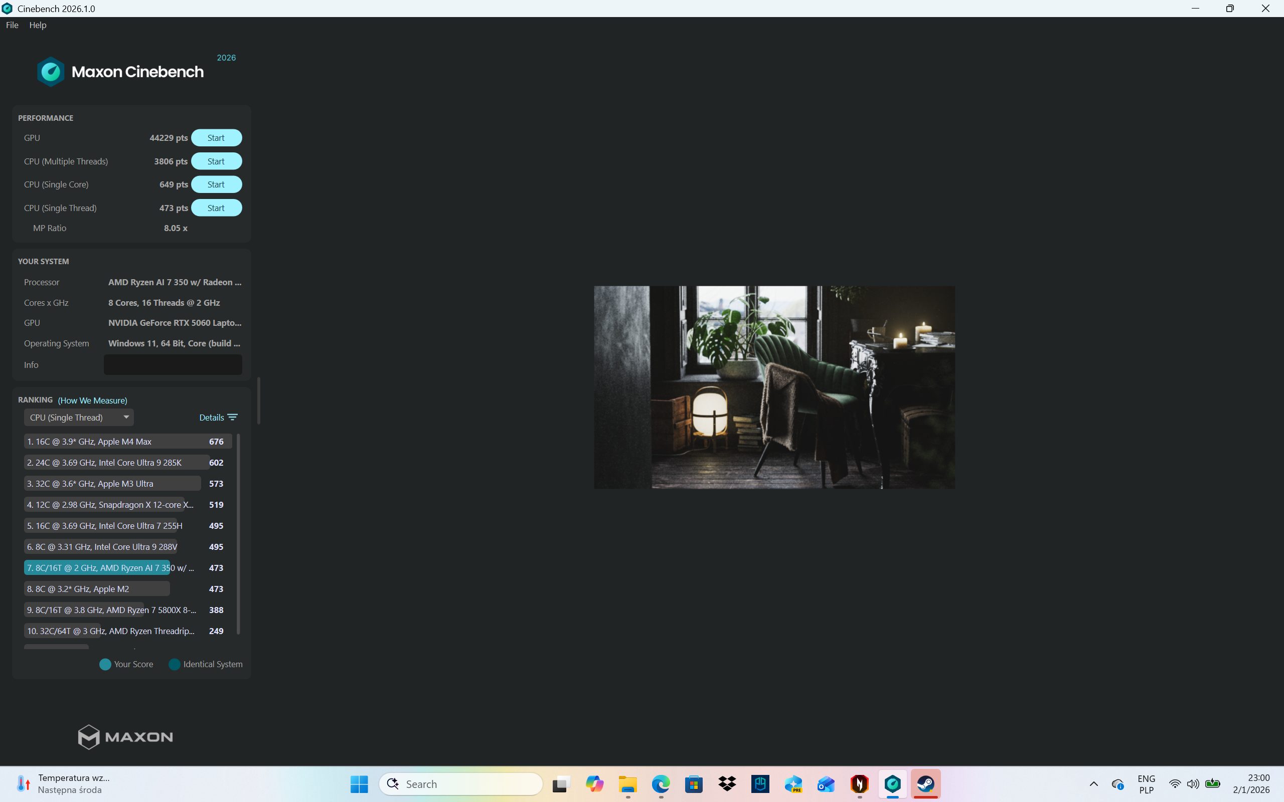 W najnowszym podejściu do testów CPU wrzuciłem Nitro 16S AI w Cinebench 2026 i tu widać, że ten Ryzen AI 7 350 nie jest tylko „dopiską” do karty graficznej. Wynik CPU Multi (Multiple Threads) 3806 pkt pokazuje, że przy obciążeniu wielowątkowym laptop potrafi utrzymać tempo — to ten typ zapasu, który czuć nie w jednej aplikacji, tylko wtedy, gdy równolegle dzieje się kilka rzeczy naraz. Z kolei w teście jednowątkowym wynik CPU (Single Thread) 473 pkt (przy jednoczesnym CPU (Single Core) 649 pkt) przekłada się na sprężystość w codziennym „klikaniu”: system, przeglądarka, przerzucanie się między oknami, drobne zadania, które lubią reagować na moc pojedynczego wątku. MP Ratio 8.05× dobrze domyka obraz całości: to konfiguracja, która nie tylko ma siłę do grania, ale też nie traci płynności, kiedy laptop ma udawać normalne narzędzie do pracy.
