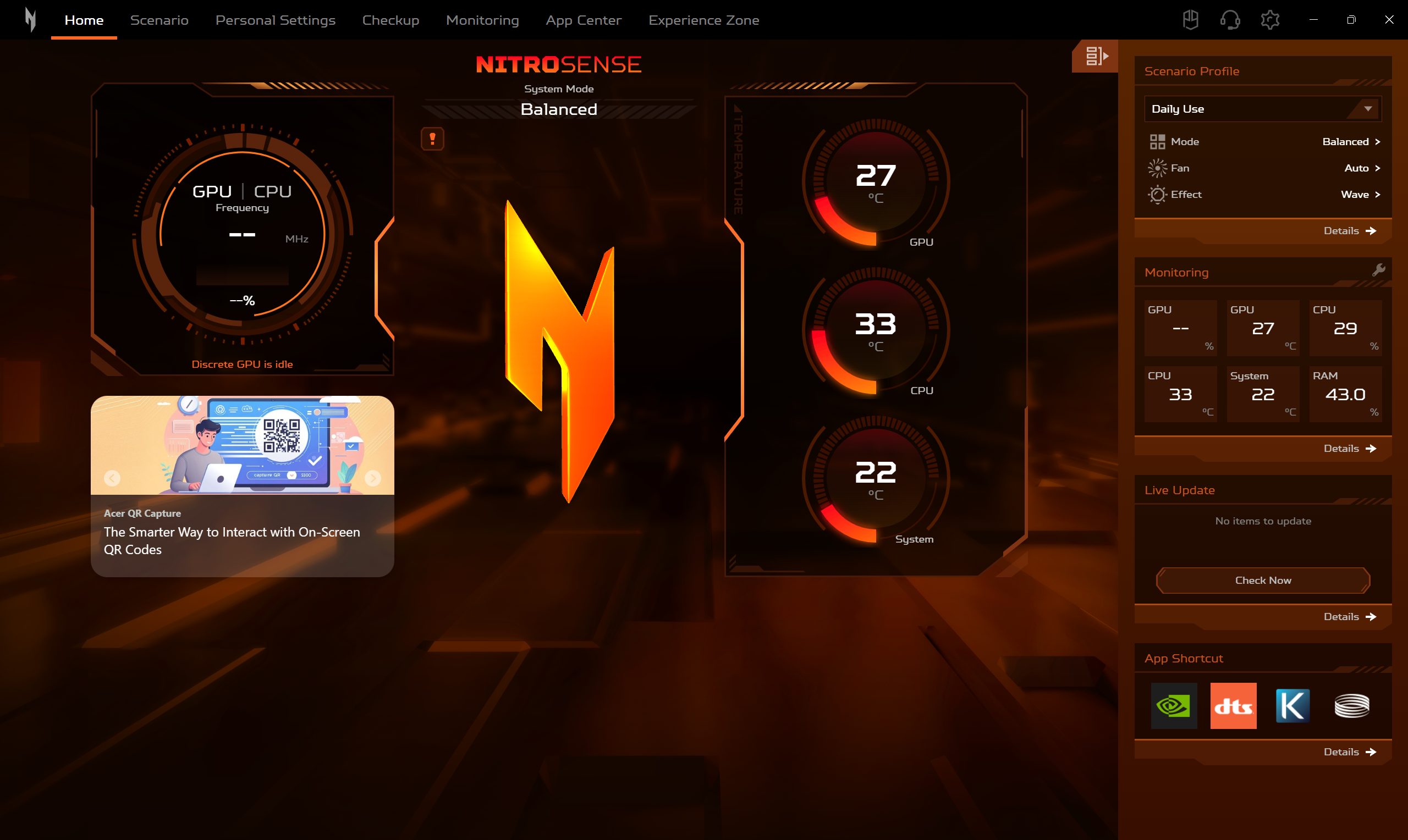 W tym miejscu sensownie wpina się też temat oprogramowania, bo Nitro 16S AI nie próbuje przykrywać swoich możliwości toną wyskakujących komunikatów. Wrażenie z użytkowania jest takie, że nie ma nachalnych pop-upów i bloatu, a centrum dowodzenia stanowi NitroSense — aplikacja, w której spinasz w jedno zarządzanie trybami i personalizację tego, jak laptop ma się zachowywać. W praktyce działa to tak, że masz szybki, czytelny dostęp do profili pracy (co dodatkowo wspiera dedykowany przycisk na obudowie), a do tego możliwość dopasowania ustawień pod własny scenariusz: raz chcesz „maksimum” pod grę, raz bardziej spokojny profil do codzienności. To jest ten typ narzędzia, który nie przeszkadza, tylko faktycznie ułatwia sterowanie komputerem bez grzebania po systemowych zakamarkach. Dodatkowo znalazła się tam zakładka Experience Zone, która kataloguje wszystkie usprawnienia dot. mikrofonu, kamerki, czyli np. PurifiedView czy ProCam.